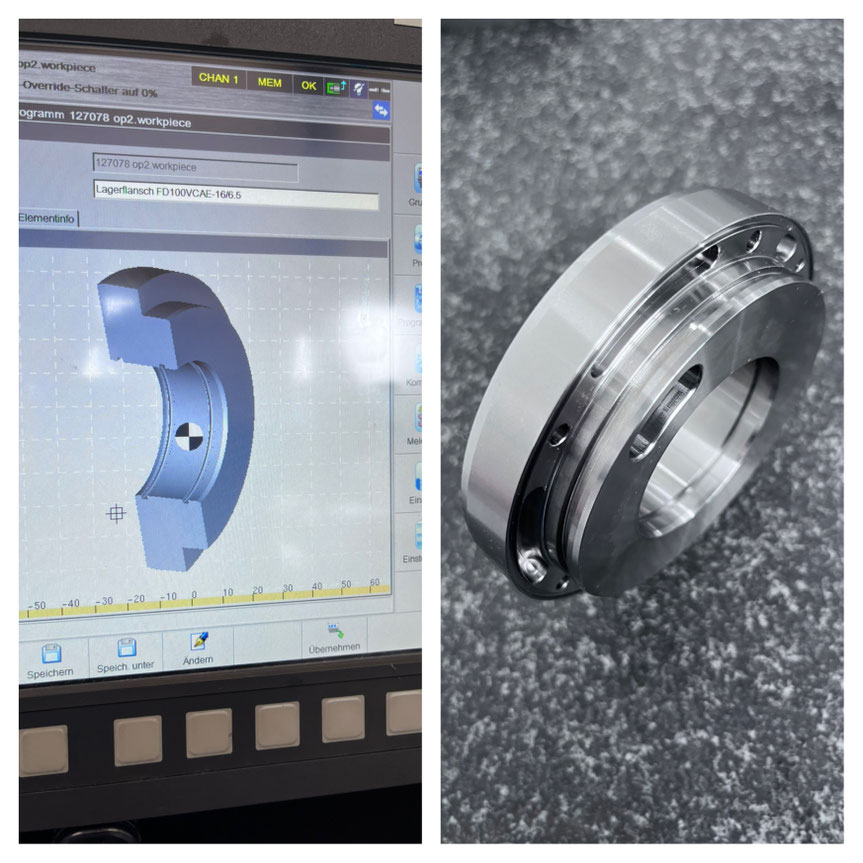 Lagerflansch kompl. in einer Aufspannung geschliffen. Per DXF Datei konnten wir dieses Werkstück Einrichten/Programmieren und den Vorgang simulieren.